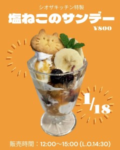 🗓️ 販売日 : 1/18(日) 🕰️ 販売時間 : 12:00〜15:00 (L.O.14:30) 🍽️ メニュー名 : シオザキッチン特製 ・濃厚ボロネーゼ 1,200円 ・塩ねこのサンデー 800円 ※数量限定・なくなり次第終了となります。